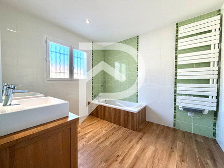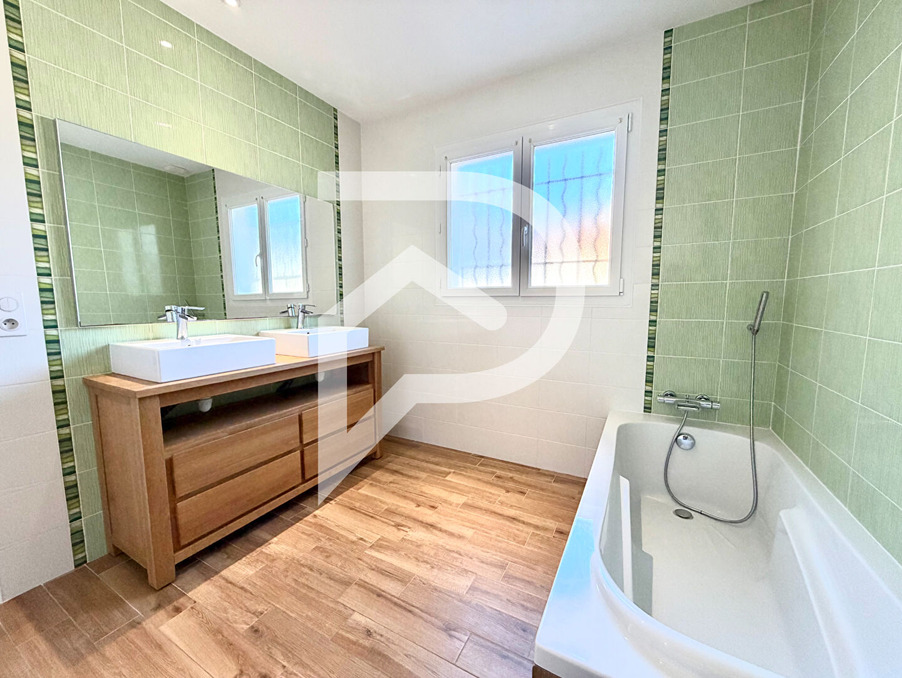 La partie nuit comprend un WC indépendant avec point d'eau, une salle de bain avec double vasque, deux chambres avec placards et rangements, ainsi qu'une suite parentale avec dressing et salle d'eau privative équipée d'une double vasque.
